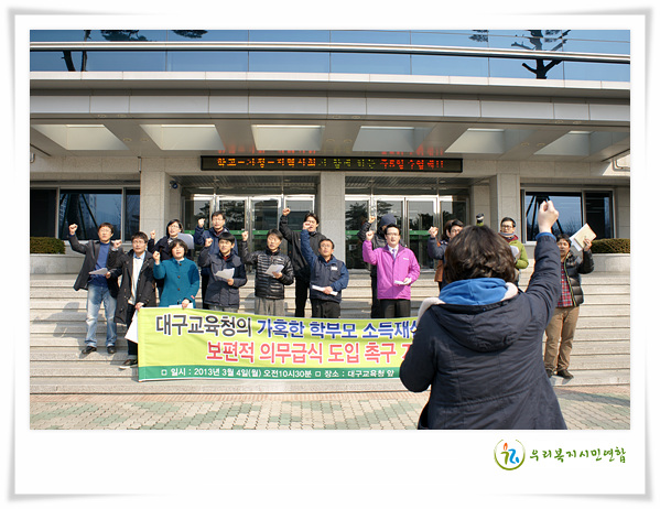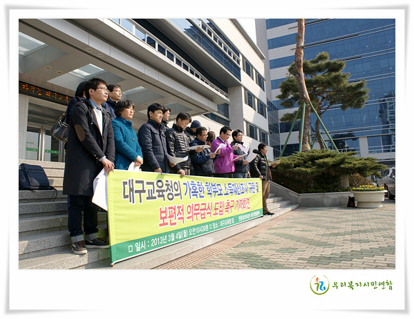 ´ë±¸±³À°Ã»ÀÇ °¡È¤ÇÑ Çкθð ¼ÒµæÀç»êÁ¶»ç ±Ôź ¹× º¸ÆíÀû Àǹ«±Þ½ÄµµÀÔ Ã˱¸ ±âÀÚȸ°ß ¡Û ÀϽà : 2013³â 3¿ù4ÀÏ(¿ù) ¿ÀÀü 10½Ã30ºÐ ģȯ°æÀǹ«±Þ½Ä Á¶·ÊÁ¦Á¤ ´ë±¸¿îµ¿º»ºÎ [¼ø¼] »çȸ : À强¿¹(¹ÎÁÖ³ëÃÑ ´ë±¸Áö¿ªº»ºÎ) [ÇØ¼³] ¿ªÁÖÇàÇÏ´Â 2013³âµµ ´ë±¸±³À°Ã» ¹«»ó±Þ½Ä ¹®Á¦Á¡ 1. 2013³â ÃÊ․Áß․°í Çб³±Þ½Äºñ ½Åû(3¿ù8ÀϱîÁö)