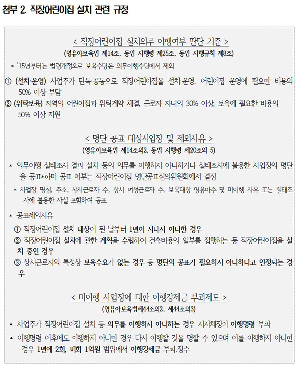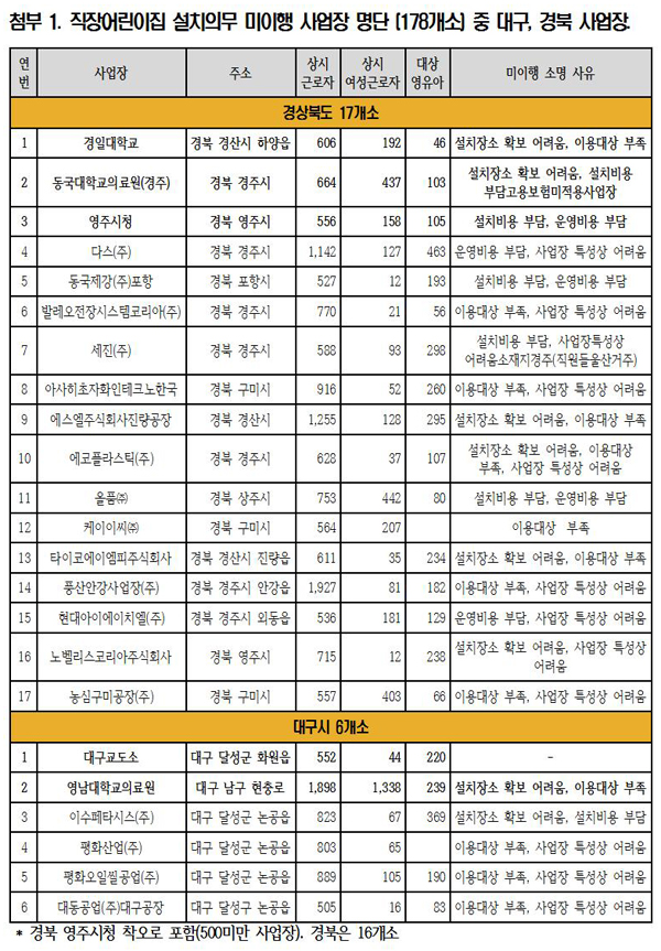 Áö³ 4¿ù 29ÀÏ º¸°Çº¹ÁöºÎ´Â ¡®Á÷Àå¾î¸°ÀÌÁý ¼³Ä¡Àǹ«¸¦ ¹ÌÀÌÇàÇÑ 178°³ »ç¾÷Àå ¸í´Ü¡¯À» °øÇ¥Çß´Ù. Á÷Àå ¾î¸°ÀÌÁýÀº »ó½Ã±Ù·ÎÀÚ 500¸í ÀÌ»óÀ̰ųª, ¿©¼º »ó½Ã±Ù·ÎÀÚ°¡ 300¸í ÀÌ»óÀÏ °æ¿ì, ¼³Ä¡ÇÒ Àǹ«°¡ ÀÖ´Ù. ¸¸¾à Á÷Àå¾î¸°ÀÌÁýÀÌ ¼³Ä¡µÇÁö ¾ÊÀº »ç¾÷ÀåÀº ±Ù·ÎÀÚ Àüü ¿µÀ¯¾Æ ÀÚ³àÀÇ 30%ÀÌ»óÀ» À§Å¹º¸À°À» Çϸé Àǹ«ÀÌÇà ÇÑ °ÍÀ¸·Î °£ÁÖÇÑ´Ù. Á÷Àå¾î¸°ÀÌÁý ¼³Ä¡Àǹ« ¹ÌÀÌÇà »ç¾÷ÀåÀº, ´ë±¸½Ã ÇØ´ç ºÎ¼´Â ÀüÈÅëÈ¿¡¼ ¡°°ø°ø±â°£ÀÎ ´ë±¸±³µµ¼Ò´Â 2019³â û»ç ÀÌÀü ¶§ Á÷Àå¾î¸°ÀÌÁýÀ» ¼³Ä¡ÇÒ °èȹÀ̰í, ¿µ³²´ëÇб³ÀÇ·á¿øÀº ³»³â 1¿ù¿¡ Âø°øÇÏ¿© 2018³â 3¿ù¿¡ °³¿øÇÒ ¿¹Á¤À̸ç, ´Þ¼º»ê´Ü ³»¿¡ 20.6¾ï¿ø(°í¿ë³ëµ¿ºÎ Áö¿ø±Ý 15¾ï, Àǹ«ÀÌÇà»ç¾÷Àå 2.6¾ï¿ø, ´ë±¸½Ã 3¾ï)À» ÅõÀÔÇØ ´Þ¼º°ø´Ü ³» ¹ÌÀÌÇà »ç¾÷ÀåÀÎ ´ëµ¿°ø¾÷(ÁÖ)°ú (ÁÖ)À̼öÆäŸ½Ã½º µî 20°³ »ç¾÷ÀåÀÌ Âü¿©ÇÏ´Â 90¸í Á¤¿øÀÇ °øµ¿Á÷Àå¾î¸°ÀÌÁýÀ» °Ç¸³Çϰí, ÆòÈȦµù½ºÀÇ °è¿»çÀÎ ÆòÈ»ê¾÷(ÁÖ)¿Í ÆòÈ¿ÀÀϾÁ°ø¾÷(ÁÖ)´Â °øµ¿À¸·Î Á÷Àå¾î¸°ÀÌÁýÀ» ¼³Ä¡ÇÒ °èȹ¡±À̶ó°í ¸»Çß´Ù. ´ë±¸Áö¿ª ¹ÌÀÌÇà »ç¾÷Àå 6°÷ ¸ðµÎ Á÷Àå¾î¸°ÀÌÁý ¼³Ä¡ °èȹÀÌ ÀÖ´Â °ÍÀ¸·Î È®ÀεǾú´Ù. ¹Ý¸é °æ»óºÏµµ´Â ÀÌÁ¦¼¾ß ¹ÌÀÌÇà »ç¾÷Àå¿¡ ´ëÇÑ Á¶»ç¸¦ ½Ç½ÃÇÒ °èȹÀ̶ó°í ÇÏ¿´´Ù. ±×¸®°í (°øµ¿)Á÷Àå¾î¸°ÀÌÁý È®´ë ¼³Ä¡ °èȹµµ ÇöÀç·Î¼´Â ¾ø´Â °ÍÀ¸·Î È®ÀεǾú´Ù. ¾îÁ¦(25ÀÏ) 11½Ã ´ë±¸°í¿ë³ëµ¿Ã»¿¡¼ ´ë±¸¡¤°æºÏÁö¿ªÀÇ Çѱ¹³ëÃÑ, °æ¿µÀÚÃÑÇùȸ, ´ë±¸»ó°øÈ¸ÀǼÒ, ´ë±¸Áö¹æ°í¿ë³ëµ¿Ã» ´ëÇ¥¿Í ´ë±¸½Ã ÇàÁ¤ºÎ½ÃÀå, °æºÏµµ Á¤¹«½ÇÀå µîÀº 'ÀÏ¡¤°¡Á¤ ¾ç¸³¹®È È®»ê°ú °áÈ¥¡¤Ãâ»ê¡¤¾çÀ° Ä£ÈÀûÀÎ ±â¾÷¹®È Á¶¼ºÀ» À§ÇÑ ½Çõ Çù¾à½Ä'À» °¡Áö°í Á÷Àå¾î¸°ÀÌÁý ¹× °øµ¿Á÷Àå¾î¸°ÀÌÁý È®´ë, Àå½Ã°£ ±Ù·Îȯ°æ °³¼±, ³²¼º À°¾ÆÈÞÁ÷ Çã¿ë µî °¡Á·Ä£ÈÀû ±â¾÷¹®È¸¦ Á¶¼ºÇÏ°Ú´Ù°í ¹àÇû´Ù. Àǹ« »ç¾÷ÀåÀÓ¿¡µµ Áö±Ý±îÁö Á÷Àå¾î¸°ÀÌÁý ¼³Ä¡Àǹ«¸¦ ¹ÌÀÌÇàÇÑ »ç¾÷ÀåÀÇ ¼Ò¸í»çÀ¯´Â °ÅÀÇ µ¿ÀÏÇϳª ´ë±¸½Ã¿Í °æºÏµµÀÇ Çຸ´Â ³Ê¹«³ª ´ëÁ¶ÀûÀ̱⠶§¹®ÀÌ´Ù. °æºÏµµ´Â ÀÌÁ¦ ¿Í¼ ½ÇÅÂÁ¶»ç¸¦ Çϰڴٰí ÇÏ´Ï °ÅÀÇ Á÷¹«À¯±â ¼öÁØÀÌ´Ù. µû¶ó¼ °æ»óºÏµµ´Â Á÷Àå¾î¸°ÀÌÁý ¼³Ä¡Àǹ« ¹ÌÀÌÇà »ç¾÷Àå¿¡ ´ëÇØ¼ Á¶¼ÓÇÑ Á¶»ç¿Í Áö¿ø°èȹÀ» ¸¶·ÃÇÏ°í °·ÂÇÑ ÇàÁ¤Á¶Ä¡¸¦ ÃëÇØ¾ß Çϸç, ±â¾÷µéÀº ÀÌÇà°Á¦±ÝÀ¸·Î ¶¼¿ì±â º¸´Ù »çȸÀû Ã¥ÀÓÀ» ´Ù Çϱâ À§ÇØ Á÷Àå¾î¸°ÀÌÁý ¼³Ä¡ °èȹÀ» Á¶¼ÓÈ÷ ¹ßÇ¥ÇÒ °ÍÀ» Ã˱¸ÇÑ´Ù.