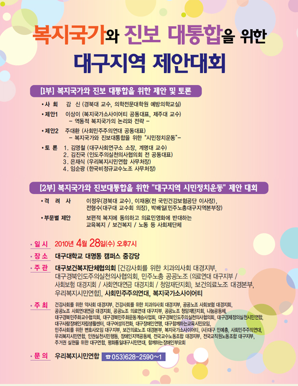 ´ë±¸º¸°Çº¹Áö´ÜüÇùÀÇȸ¿Í »çȸ¹ÎÁÖÁÖÀÇ¿¬´ë, º¹Áö±¹°¡¼Ò»çÀÌ¾îÆ¼°¡ °øµ¿ÁÖ°üÇϰí 28°³ ½Ã¹Î»çȸ³ëµ¿´ÜüµéÀÌ °øµ¿ÁÖÃÖÇÏ´Â ¡®º¹Áö±¹°¡¿Í Áøº¸ ´ëÅëÇÕÀ» À§ÇÑ ´ë±¸Áö¿ª Á¦¾È´ëȸ¡¯¸¦ ¾Æ·¡¿Í °°ÀÌ °³Ãֵ˴ϴÙ.