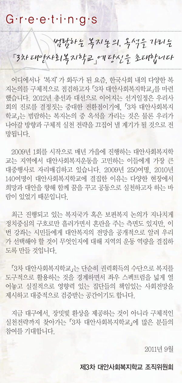 Á¦3Â÷ ´ë¾È»çȸº¹ÁöÇб³ °³°(10.13~11.17) ½Åû ¾È³»2011.09.19 ±Û¾´ÀÌ : º¹Áö¿¬ÇÕ |
