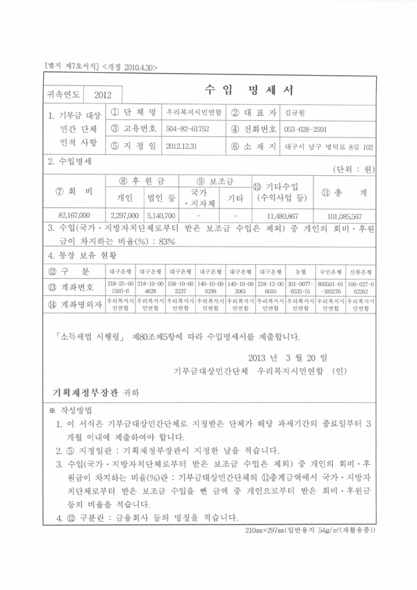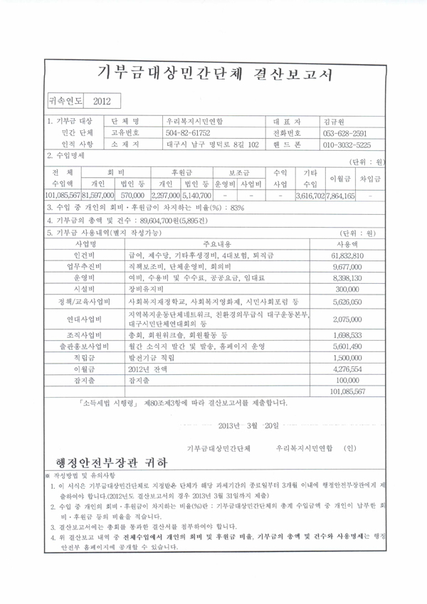 2013³â ÇàÁ¤¾ÈÀüºÎ, ±âȹÀçÁ¤ºÎ Á¦Ãâ ±âºÎ±Ý´ë»ó¹Î°£´Üü °á»êº¸°í¼ ¹× ¼öÀÔ¸í¼¼¼2013.03.28 ±Û¾´ÀÌ : º¹Áö¿¬ÇÕ |