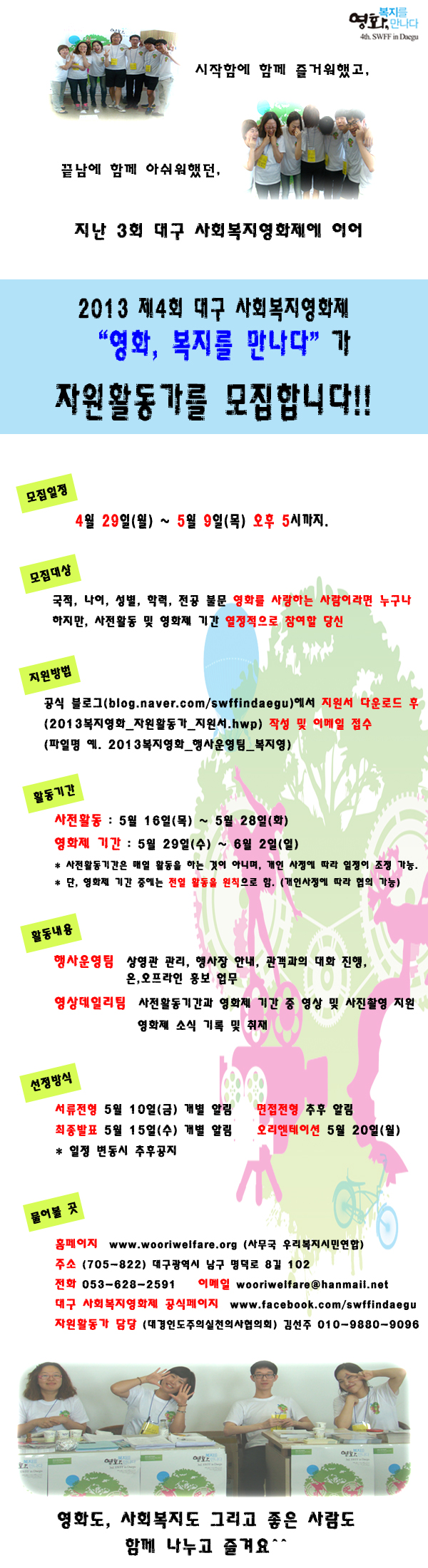 Á¦4ȸ ´ë±¸ »çȸº¹Áö¿µÈÁ¦ "¿µÈ, º¹Áö¸¦ ¸¸³ª´Ù"¿¡¼ ÀÚ¿øÈ°µ¿°¡¸¦ ¸ðÁýÇÕ´Ï´Ù.