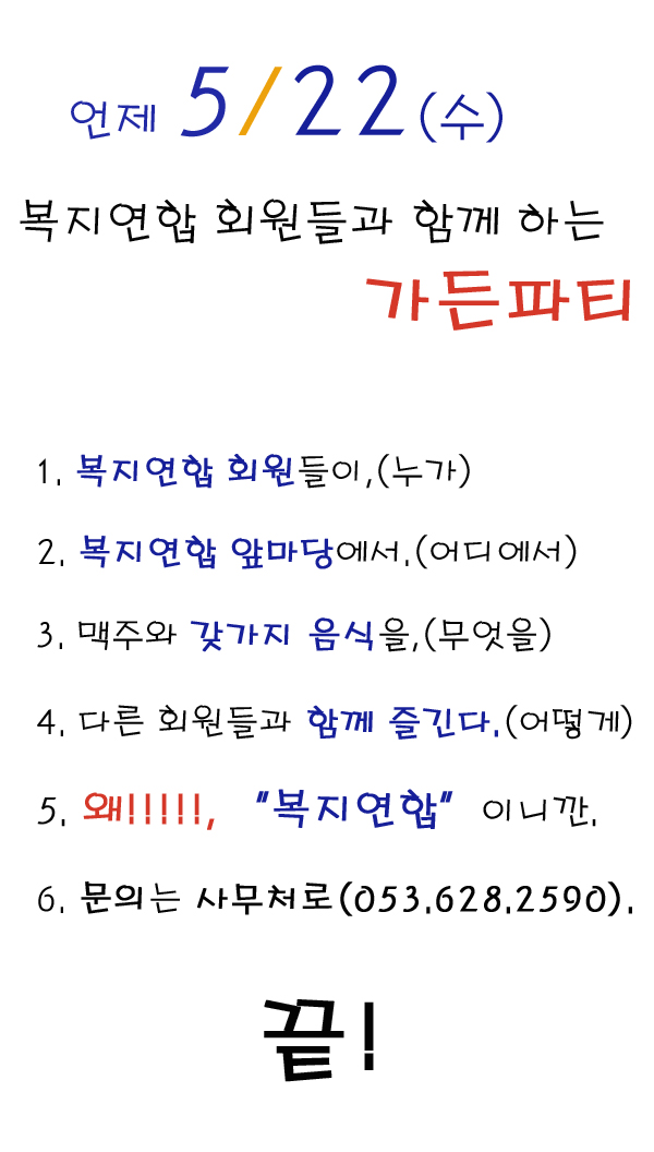 - ÀϽÃ: 2013³â 5¿ù 22ÀÏ(¼ö) Àú³á 7½ÃºÎÅÍ Áý¿¡ °¥ ¶§ ±îÁö~ - Àå¼Ò: º¹Áö¿¬ÇÕ »ç¹«½Ç(´ë±¸´ë ´ë¸íµ¿ Ä·ÆÛ½º Á¤¹® ¾Õ) - ´ë»ó : º¹Áö¿¬ÇÕ È¸¿øºÐµéÀÌ¸é ´©±¸³ª. Áö±Ý ÇÔ²² ÀÖ´Â ºÐ°ú °°ÀÌ ¿À¼Åµµ µË´Ï´Ù. - ¹®ÀÇ: (053)628-2591. ÇÑÈ£½Â Ȱµ¿°¡