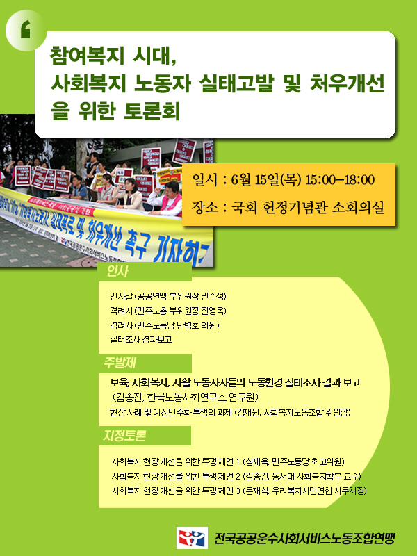 Âü¿©º¹Áö ½Ã´ë, »çȸº¹Áö³ëµ¿ÀÚ ½ÇŰí¹ß ¹× ó¿ì°³¼±À» À§ÇÑ Åä·Ðȸ Âü¿©(6.15)