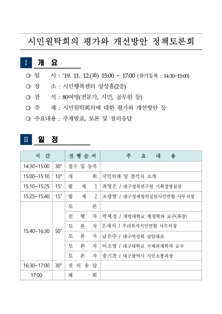 ½Ã¹Î¿øÅ¹È¸ÀÇ Æò°¡¿Í °³¼±¹æ¾È ½Ã¹ÎÁ¤Ã¥Åä·Ðȸ °³ÃÖ2019.10.30 ±Û¾´ÀÌ : º¹Áö¿¬ÇÕ |